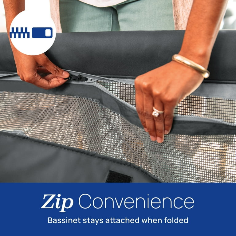 The Dash™ Playard is ready for baby from day one. The padded mattress fits snugly in the bassinet which is raised for easy access to your little one. The zip-on, full-size bassinet stays attached when folded for ultimate convenience. No need to remove and reinstall the bassinet every time you store the playard!