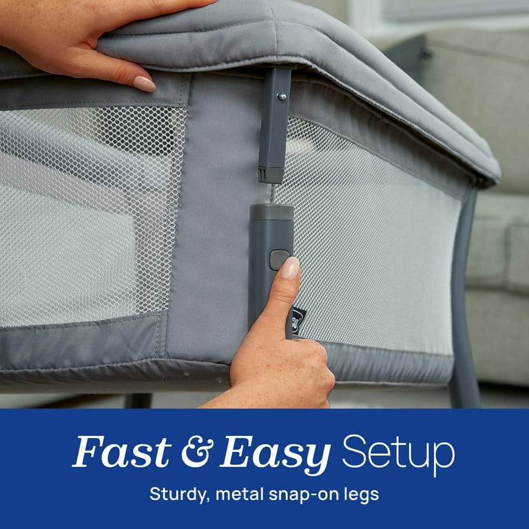 Sturdy metal legs snap on in seconds for easy setup. LullaGo® Anywhere folds flat and fits inside the included carry bag for effortless travel and storage. The LullaGo® Anywhere is GREENGUARD Gold Certified, meaning it is independently tested for low chemical emissions, contributing to healthier air quality around baby.