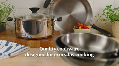 Quality, reliable stainless steel cookware made for everyday cooking. Farberware Reliance Stainless Steel is designed to cover all the essentials with convenience and ease—from preparing meals for the whole family to whipping up quick bites. These pots and pans are made from durable stainless steel with a sealed, edge-to-edge base that offers superior heat performance and adds strength to help withstand wear and tear. This design promotes even heating without hotspots so you can cook meats and veggies with confidence. The polished stainless steel design has a gorgeous finish that will shine in any kitchen. With stay cool-handles, shatter-proof lids, and rolled rims for easy pouring, this collection was built for cooks looking for long-lasting cookware and everyday convenience