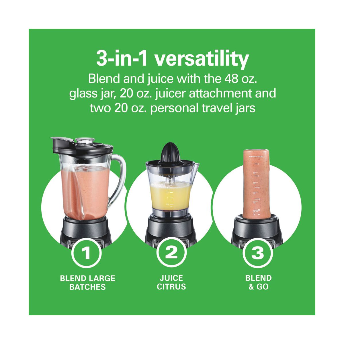 Take your beverages and recipes to the next level with the Hamilton Beach® 3-in-1 Blend & Juice System. It's like having 3 appliances in 1 multi-tasking appliance. Keep it in your kitchen to add fresh juice to smoothies, icy drinks or cocktails, make homemade orange juice or lemonade with the juicer attachment or blend and go with the 2 personal jars with travel lids. Powerful blending performance is assured with 825 watts of peak power, and the patented Wave~Action® System pulls the mixture down into the blades for ultra-smooth results. The unique pour spout on the lid of the 48 oz. glass jar eliminates messy drips to make serving easy, while the included tamper helps ensure that thick mixtures and smoothie bowls are blended to the best texture and consistency. Includes 48 oz. glass jar for large batches, 20 oz. citrus juicer attachment with 2 nesting reamers and two 20 oz. personal jars with travel lids. Backed by Hamilton Beach with a 3 year limited warranty.