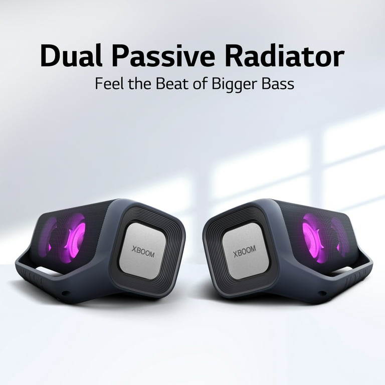 PREMIUM PARTY SOUND WITHOUT BOUNDARIES Get ready because the party is here, and you can take it anywhere you want with our top-of-the-line LG XBOOM Go P7, featuring premium immersive sound—it’s our biggest portable speaker for your bigger-than-life parties. Bring the best-in-class sound experience in a compact, easy-to-party package with the LG XBOOM Go, featuring Meridian Audio Technology for clear, crisp detail at any volume. Finally, Dual Passive Radiators bring bigger, booming bass with a full range of sound, so you can feel the beat wherever you go.