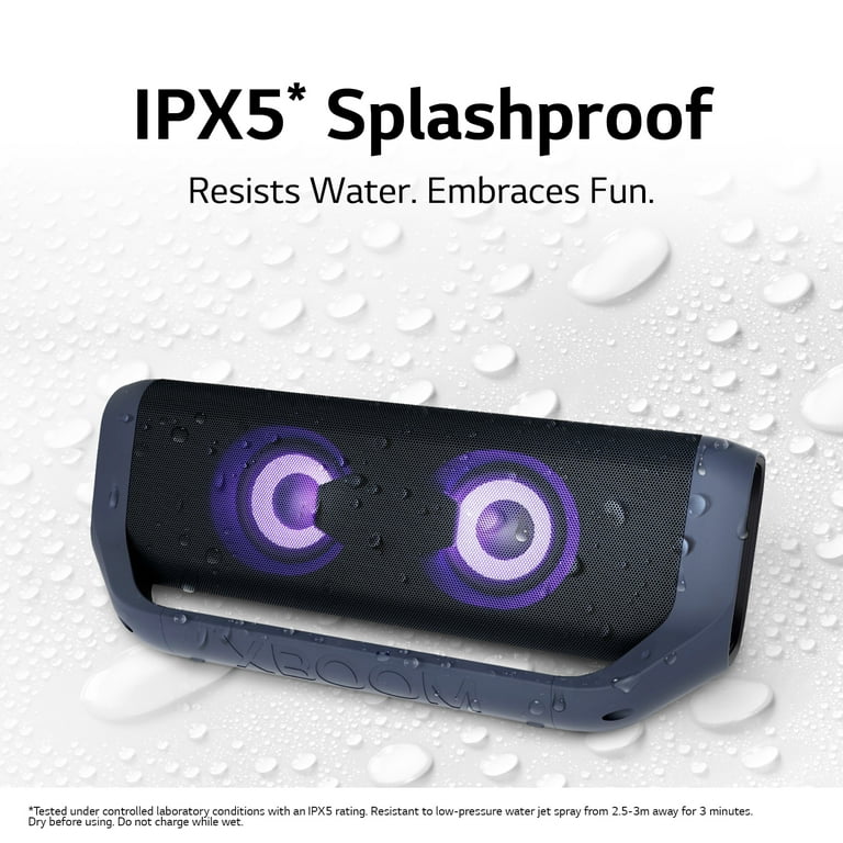 .Resists Water - Embraces Fun - The IPX5 water-resistant** LG XBOOM Go means any party can be a pool party without worrying about a little splash putting a damper on your good time. **Tested under controlled laboratory conditions with an IPX5 rating. Resistant to low-pressure water jet spray from 2.5-3m away for 3 minutes. Dry before using. Do not charge while wet