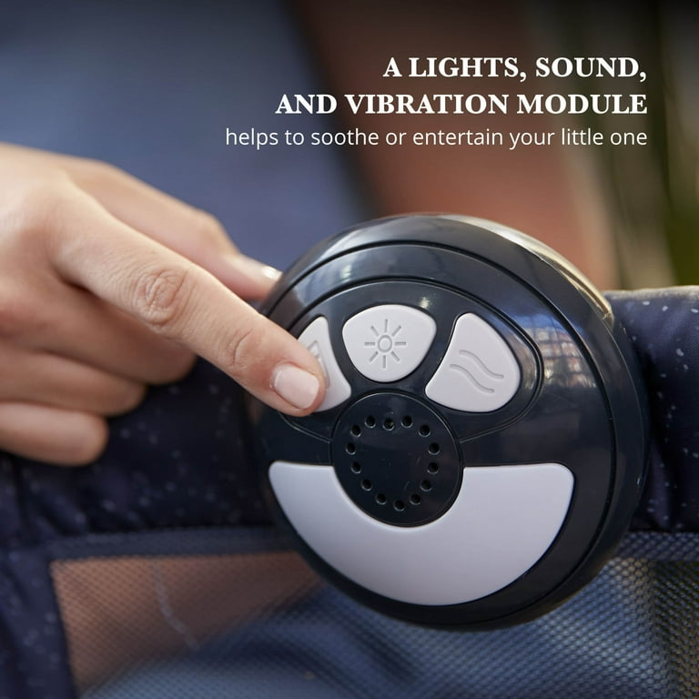 A lights, sound, and vibration module helps to soothe or entertain your little one