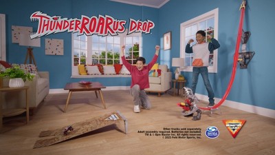 Put the Monster Jam stunts in your hands with the Monster Jam ThunderROARus Drop Playset Standing 6 feet high, this is the tallest Monster Jam playset yet. Load your Monster Jam truck and crank the handle to watch it gain height. Witness it release at the top and perform three amazing Monster Jam stunts like a high jump, front flip, and a corkscrew as it shoots out the Dino’s mouth. The Dino’s head comes to life with lights and sounds. Watch the vertical drop propel your car toy to new heights. This set comes with an exclusive ThunderROARus Truck in 1:64 scale die cast. Holds 4 additional monster trucks at the base so they are ready for action. (sold separately). The assembly of the playset is a breeze and sticks safely on the wall via 3M Command Strips. Adjust, load, and crank your monster truck toys for loads of Monster Jam fun. Use the packaging as a template to set up this playset on the wall. Landing ramp is included to get your ThunderROARus Drop thrills going. With so many other Monster Jam trucks to collect, add Grave Digger, Max-D, El Toro Loco and more (each sold separately) to your collection and race them all! Monster Jam toys like remote control car and trucks are the perfect gifts as girl and boy toys, ages 3 and up. Drop into the Monster Jam action with the ThunderROARus Drop Playset. Includes: 1 1:64 Scale Monster Jam Truck, 1 Wall Bracket Top, 1 Wall Bracket Bottom, 7 Large Command Strips, Monster Jam Sign, Top Triangle Mount, Bottom Triangle Mount, 2x Crank Arms, Folding Main Track, 3 Track Pieces, Track Support, 4 Track Support Legs, Stunt dial Assembly, Feature Dino Head, Left Bottom Jaw, Right Bottom Jaw, Left Arm, Right Arm, Sicker Sheet, Landing Ramp, Landing Ramp Frame, 3 Instruction Sheets